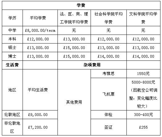 2013年英國留學(xué)費用一覽表